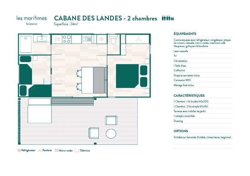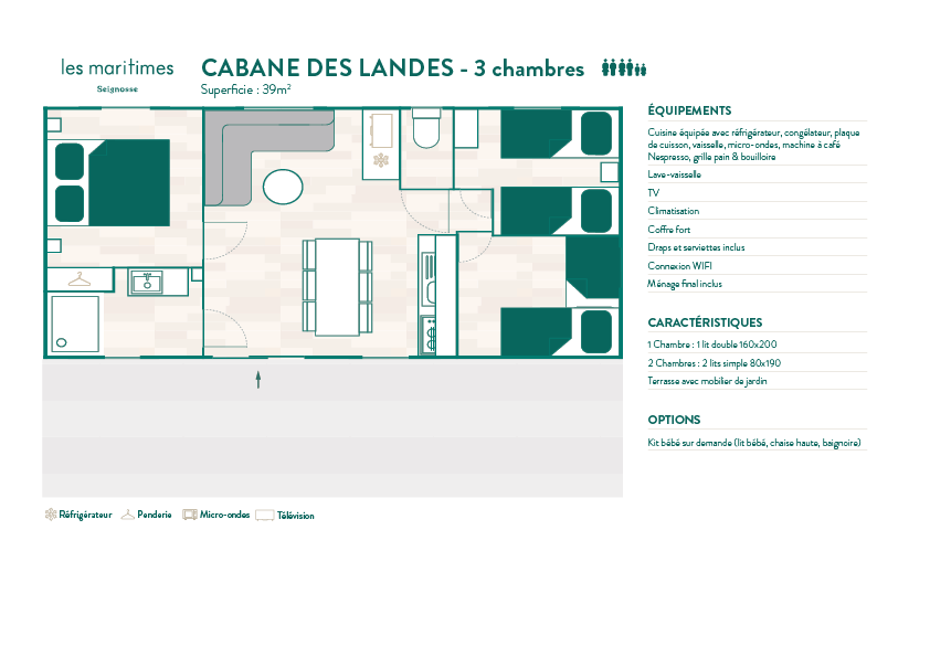 With 2 or 3 bedrooms, a welcoming living space, and a fully equipped kitchen, the Cabane des Landes is designed for friends and families alike. Seamless indoor–outdoor spaces make shared living easy, while Rivages’ thoughtful touches — beds made on arrival, linens provided, a welcome kit, Wi-Fi, and end-of-stay cleaning included — lighten your load.
