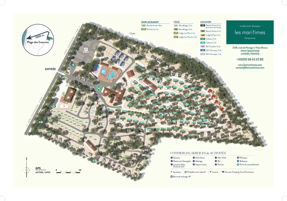 En el corazón de la campiña de las Landas, localice fácilmente su Cabane des Landes o su Beach House gracias a la numeración en el mapa. Con la opción Mi alojamiento también puede elegir el número concreto que usted prefiera.